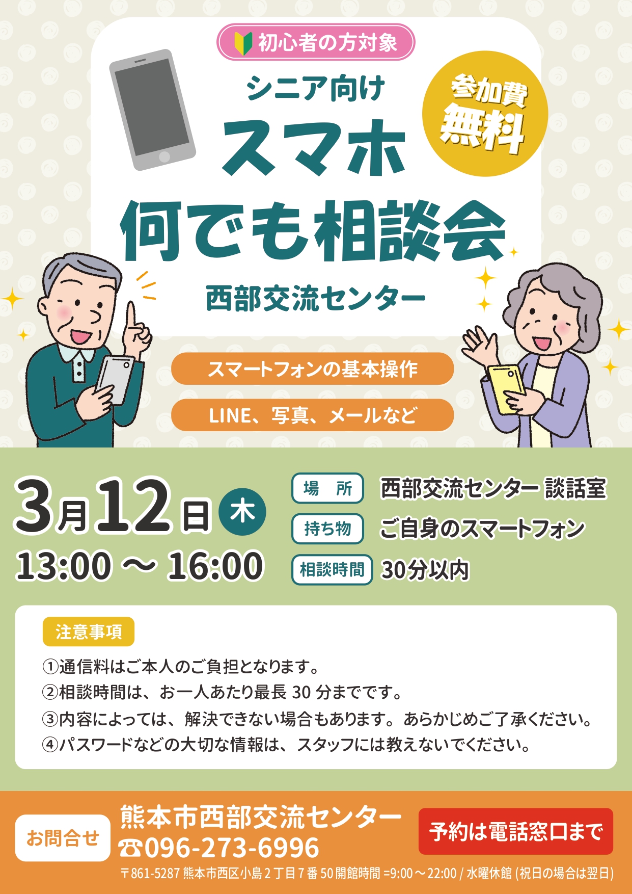 熊本市西部交流センターでは、スマートフォンの操作などにお悩みをお持ちの方を対象に、「スマホ何でも相談会」を開催いたします。